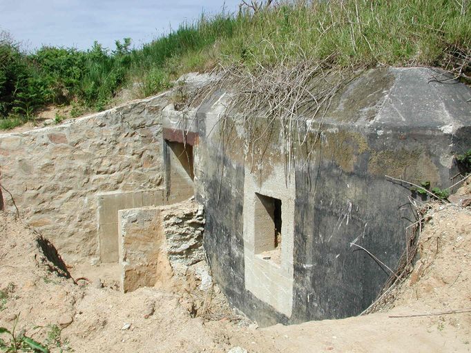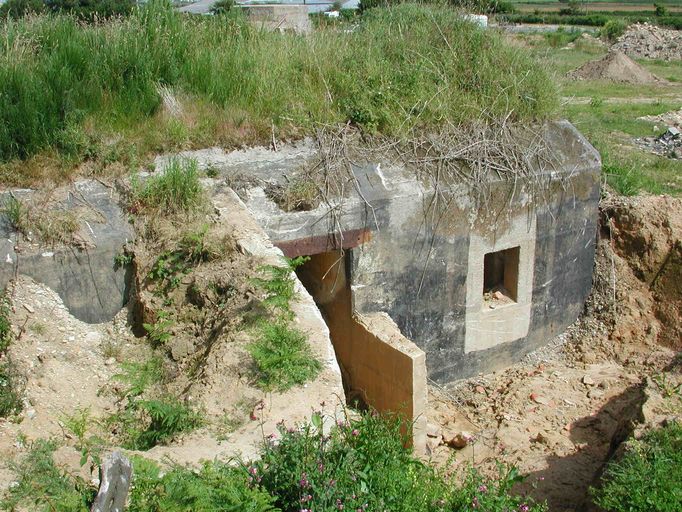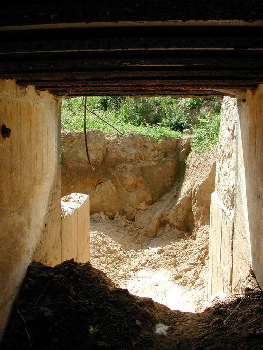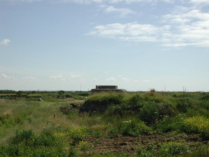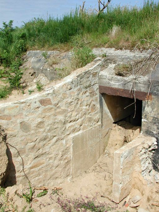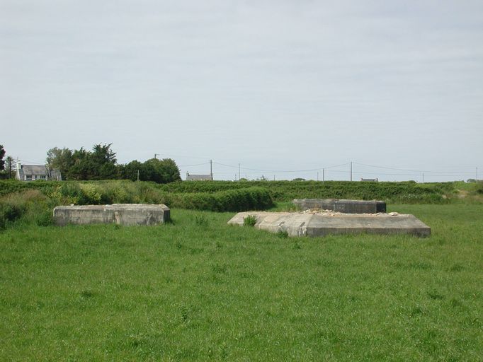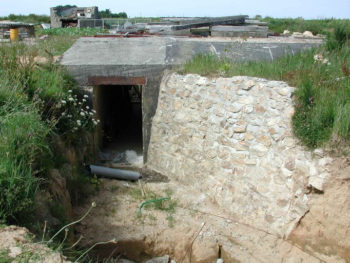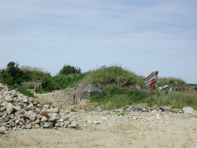Batterie d'artillerie en cours de construction composée d'une seule casemate et de plusieurs plateformes de tir. Nombreuses soutes à munitions de type M 134. Abris à personels.