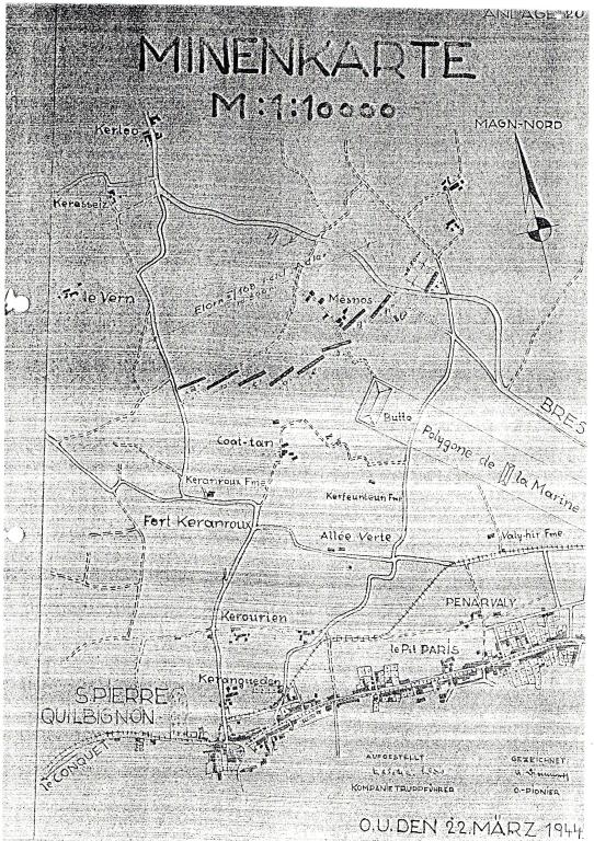 Les photographies aériennes d’août et septembre 1944 montrent ce secteur totalement ravagé et bouleversé par les bombardements. Les cratères en forme de cône allongés vers le sud-est sont attribuables aux tirs navals du cuirassé HMS Warspite depuis le large de Ploudalmézeau le 25 août : le fort de Keranroux est visé à 51 reprises avec ses canons de 15 pouces (obus de 381 mm). Plusieurs coups sont au but malgré la distance de plus de 25 km. Le fort et les nids de résistance des fossés anti-chars tombent le 13 septembre 1944. Sur les photographies aériennes de 1944 et 1955, les tranchées de communication entre les bunkers et les postes de mitrailleuse ouverts (Offene M.G.-Stände) sont plus ou moins visibles du fait des bombardements et des combats de la Libération, des remblais et de la remise en culture rapide des terres agricoles.