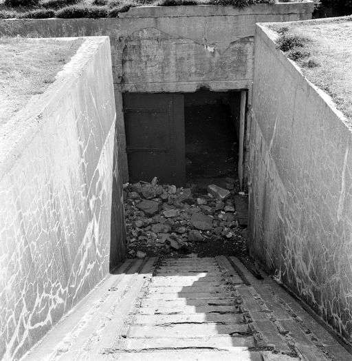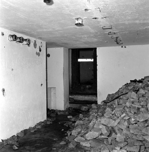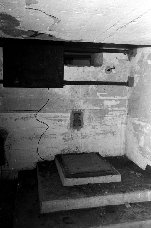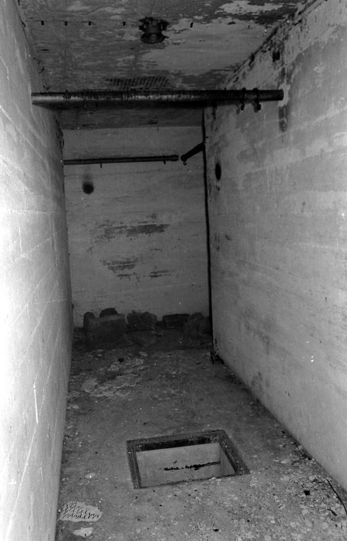 - A droite, la porte d'entrée du personnel menant aux locaux des postes de commandement. Cette porte dessert un premier vestibule (3) avec, à droite, une grande pièce rectangulaire (4) et, dans l'axe de l'entrée, une autre pièce rectangulaire (5) séparée, par piédroit percé d'une porte ; d'une seconde pièce identique (6) communiquant à la fois à l'arrière avec la pièce (4) et à l'avant avec le poste de télémètre (7). Un puits carré dans le plafond, relie le local (6) au poste d'observation (8) situé au-dessus.