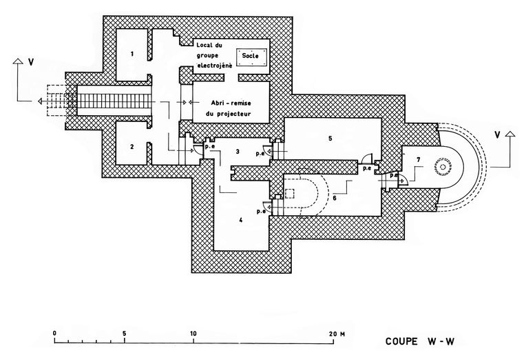 Poste de télémétrie (7) local rectangulaire à l'arrière, hémicylindrique à l'avant surélevé par rapport aux autres locaux du bloc ; large fente de visée en demi-cercle ; dans le sol : goujons de scellement d'embase d'appareil.