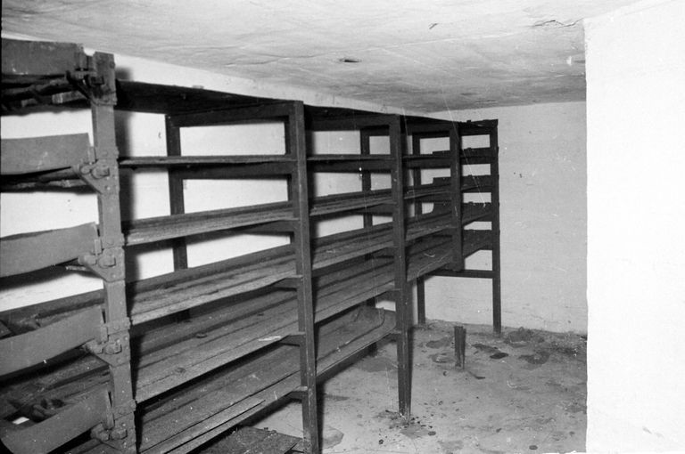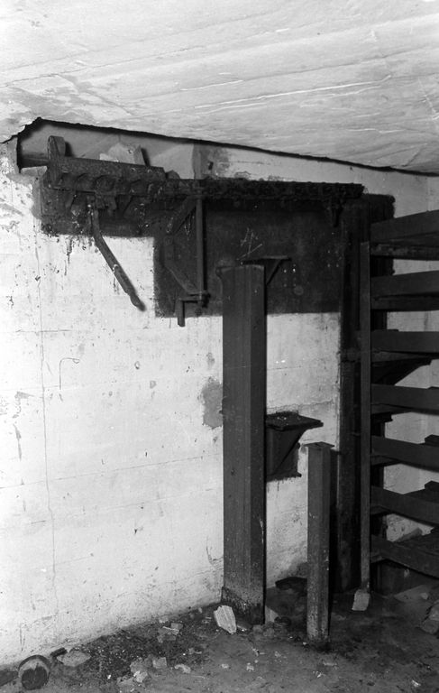 - L'existence dans le magasin à obus, d'étagères métalliques organisées pour un transport rapide des projectiles vers les guichets de distribution (restes d'un treuil à main).