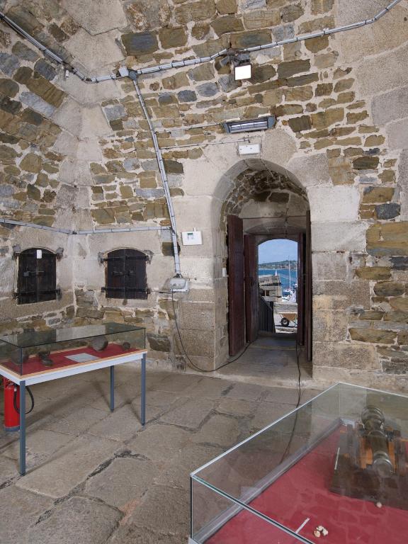 Percé dans la courtine de gorge flanquée d´une galerie de fusillade, le pont-levis à flèches et son pont dormant permettent de franchir le fossé (en eau à marée haute) et d´accéder à la batterie circulaire et au corps de garde défensif doté de 6 créneaux. Un deuxième corps de garde similaire au premier se trouvait à la place de l´actuel four à boulets (construit lors de la période révolutionnaire).