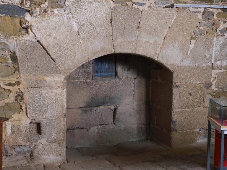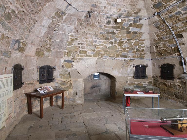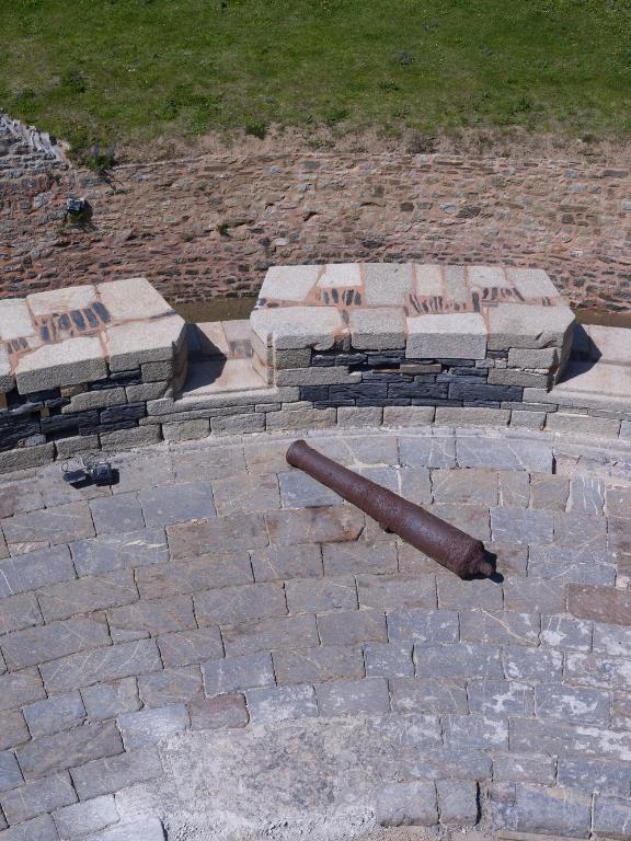 Sur le dallage de la plate-forme, on décèle les traces en arc de cercle permettant le guidage et la rotation des affûts sur roulettes du XIXe siècle.