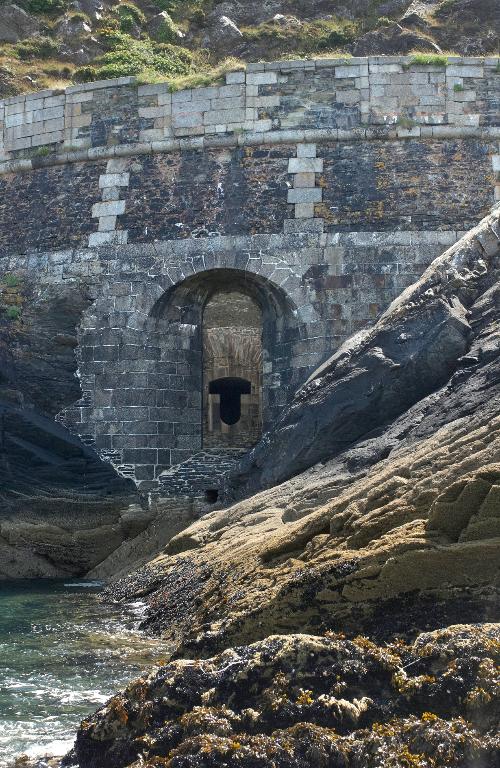 - Pour donner aux casemates une protection verticale suffisante tout en restant le plus bas possible sur l´eau, on a été conduit à creuser la batterie sous la falaise et derrière la batterie basse. Par voie de conséquence, on a pratiqué transversalement dans la plate-forme de la batterie basse deux gorges profondes correspondant au délardement de champ de tir des deux embrasures de 32 cm. Le soutènement de l´escarpe de la batterie basse est rétabli, au droit de chaque gorge, par un arc de décharge formant à la fois ponceau et visière : arc surbaissé à gauche, plein cintre à droite. Ces arcs sont traités avec beaucoup de soin, claveaux et montants en granite appareillé.