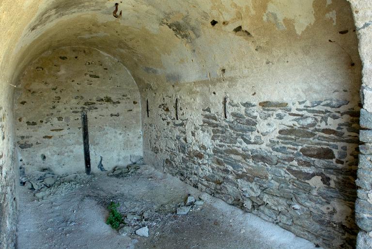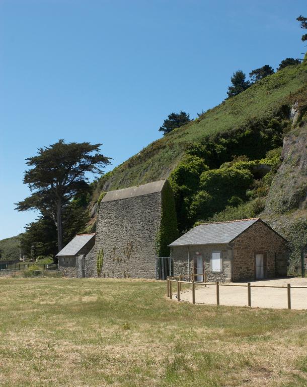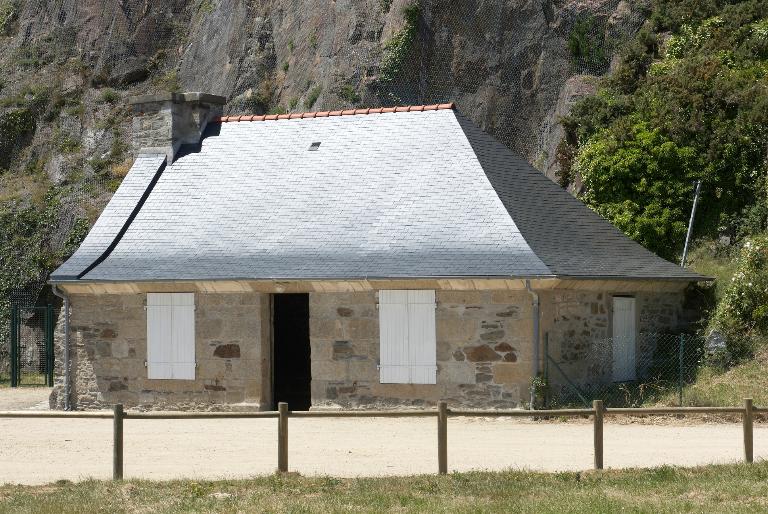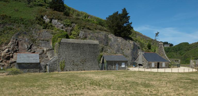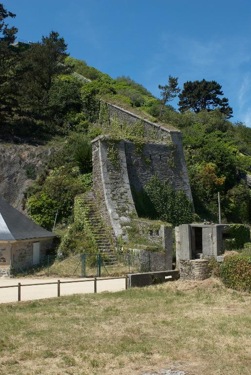 Sur les huit bâtiments construits sur le terre-plein de la batterie basse (casernes et magasins) en 1807, trois bâtiments en alignement orientés est-ouest (corps de garde, remise et magasin à poudre) et adossés à la falaise, subsistent. Le plus remarquable, situé à l’extrémité est, consiste en un bâtiment couvert à deux pans à coyaux en ardoises et renseigné en 1696 comme "logements des canonniers, halle et corps de garde". Deux "branches tombantes" - murs d’enceinte percés de créneaux de mousqueterie et escaliers en parallèle - ferment les flancs à l’est et à l’ouest. Deux pont-levis à flèches permettaient d’accéder aux batteries haute et basse. Un magasin à poudre a été aménagé dès la fin du 17e siècle dans la falaise.