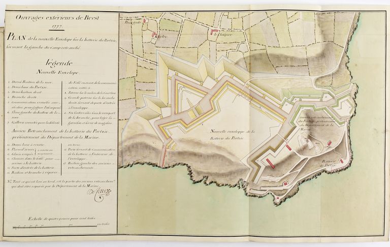 Archives départementales d´Ille-et-Vilaine Série C. Administrations provinciales. Intendance de Bretagne et subdélégations ; Etats de Bretagne, commission intermédiaire et commissions spéciales des Etats. C 968 (1) : Le 28 janvier 1701, M. de Bouridal. Brest. 1er plan. Premier plan de Brest du côté de Recouvrance relatif au procès verbal des héritages pris à la seignerie du Chastel en 1672. A Brest le 20 janvier 1701 par Mollart. Plan de Brest côté de Recouvrance pour faire voir les terrains pris à divers particuliers depuis l'année 1672 jusqu'en 1686 pour les anciens retranchements de terre, batiments, magasins et autres emplacements pour le service du Roi où l'on a distingué les terrains de chaque propriétaire par les couleurs ci-après : La verte marque le terrain à Madame la Duchesse de Portsmouth, Le gris de (lain) [lin] EE au Sieur de Nouailles, Le vermillon FG au Sieur Le Gal, La sanguine GH, LM au Sieur l'Armorique, Le jaune IK au Sieur de Map, Le carmin KL à Madame de K (?) uein, Le bleu BB au Sieur de Belleveue. C 968 (2) : Le 28 janvier 1701, M. de Bouridal. Brest. 2ème plan. Second plan de Brest du côté de Recouvrance relatif au procès verbal des héritages pris à la seignerie du Chastel depuis 1689. A Brest le 22 janvier 1701 par Mollart. Plan de Brest côté de Recouvrance pour faire voir les terrains pris à divers particuliers depuis le commencement de l'année 1686 jusqu'à la fin de 1700 pour faire la nouvelle enceinte de muraille, remparts, fossés, chemins couverts, demie lune, glacis et rue au pied du rempart, l'on a distingué les terrains de chaque propriétaire par des couleurs différentes. Le gris de (lin) [lin] coté iii et 2 au Sieur de Nouailles, Le vermillon coté 3 au Sieur Le Gal, Le gris coté 4 au Sieur Charles, La sanguine coté 5, 10 et 11 au Sieur de L'Armorique, Le jaune coté 6 au Sieur Le Map, Le bistre coté 7 aux Pères Capucins, Le carmin coté 8 et 9 à Madame de K (?) uein, Le bleu coté 12 et 13 au Sieur de Belleveue, Le vert coté 16, 17 et 18 à Madame la Duchesse de Portsmouth, Les trois perrières [carrières] cotées au plan 23, 24 et 25 à la dite Dame, Les deux fours à chaux cotés ee à la dite Dame, Le corps de garde pour la nuit coté 22 à la dite Dame. C 968 (3) : Le 23 mars 1703, M. de Bouridal. Brest. 1er plan. Premier plan de l'enceinte du côté de Brest relatif au procès verbal des héritages compris dans les fortifications. A Brest le 1er août 1702 par Mollart. Brest, 1702 Premier plan de l'enceinte côté de Brest Plan des anciens retranchements de terre faits du côté de Brest en 1674 dont l'on ne compte la non jouissance du terrain qu'ils ont occupé que jusqu'au commencement de 1690 attendu que les propriétaires en ont pû jouir du depuis. C 968 (5) : Le 23 mars 1703, M. de Bouridal. Brest. 3ème plan. Plan de Brest relatif aux 3ème et 4ème procès verbaux des héritages pris pour les fortifications de l'enceinte du côté de Brest. A Brest le 10 juin 1702 par Mollart. Brest, 1702 Plan de Brest pour faire voir les terrains pris à divers particuliers tant pour la nouvelle enceinte de muraille, ses remparts, fossés, chemins couverts, demi-lunes et glacis que pour la rue au pied du rempart et emplacements des bâtiments pour le service de Sa Majesté. C 969 (1) : Le 8 juillet 1701, M. de Bouridal. Brest. Plan du front du château de Brest du côté de la ville sur lequel on a marqué les héritages pris et démolis pour les fortifications, chemins couverts et glacis et ceux que l'on a proposé de prendre pour l'agrandissement de l'esplanade. Fait à Brest le 17 septembre 1700 par Traverse. Plan des ouvrages du front du château de Brest du côté de la ville avec les emplacements des maisons et héritages qui ont été et seront compris dans l´étendue des glacis et esplanade. La ligne colorée de vert détermine l'étendue du glacis à 15 toises suivant l'ordonnace. Les lignes ponctuées colorées de rouge marquent les emplacements des maisons et jardins qui ont été démolis pour former le glacis. Les lignes ponctuées colorées de jaune marquent les fonds et terrains qui ont étét compris dans l'étendue des glacis et esplanade. La ligne ponctuée marquée 31 détermine l'étendue de l'esplanade. Noms des propriétaires des maisons et héritages. [...] C 969 (2) : Plan de la place d´armes dite champ de bataille de Brest. A Brest le 15 février 1730 par Dumains. C 980 (1) : Plan des terrains qu´il convient d´acquérir pour la construction d´un polygone pour les exercices de l´artillerie de l´école de Brest. A Brest le 21 avril 1763. C 980 (2) : Fortifications de Brest. Plan des terrains que doit occuper l´agrandissement d´enceinte sur la hauteur de la carrière du Pape, 1789.