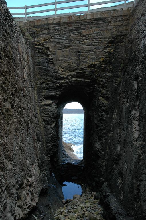 - Pour donner aux casemates une protection verticale suffisante tout en restant le plus bas possible sur l´eau, on a été conduit à creuser la batterie sous la falaise et derrière la batterie basse. Par voie de conséquence, on a pratiqué transversalement dans la plate-forme de la batterie basse deux gorges profondes correspondant au délardement de champ de tir des deux embrasures de 32 cm. Le soutènement de l´escarpe de la batterie basse est rétabli, au droit de chaque gorge, par un arc de décharge formant à la fois ponceau et visière : arc surbaissé à gauche, plein cintre à droite. Ces arcs sont traités avec beaucoup de soin, claveaux et montants en granite appareillé.