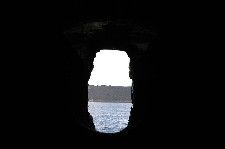 - Accès par la droite, par galerie ascendante et escalier débouchant dans une petite crique au pied du flanc droit de la batterie basse.