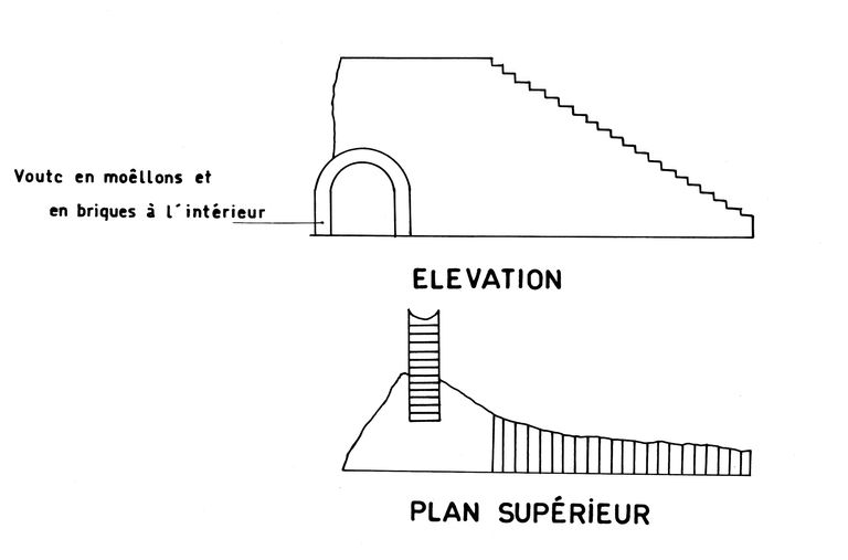 - Un magasin à munitions de batterie de six mètres quatre-vingt dix centimètres par trois mètres en béton armé logé sous l´extrémité droite de la plate-forme avec deux portes donnant sur la rue du rempart, couverte en ce point d´une dalle de 27 centimètres en béton armé.
