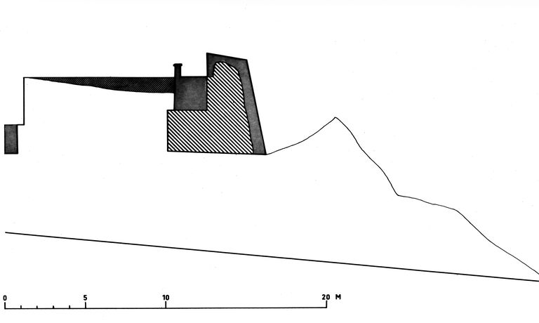 Nota : l´emprise de la batterie a manifestement été obtenue en entaillant le pied de la falaise. De même, l´assise de l´escarpe a nécessité un nivellement préalable du massif rocheux sur lequel elle se fonde.