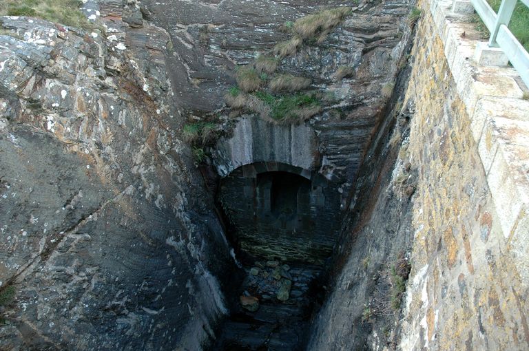 Description : l´ouvrage est constitué par un tronçon de galerie creusé dans la falaise, perpendiculairement à la côte et précédé, à l´extérieur, d´une plate-forme bétonné, initialement à ciel ouvert, où se trouvait boulonné, l´affût du tube lance-torpilles. Le sol de cette plate-forme a partiellement disparu (affouillement).
