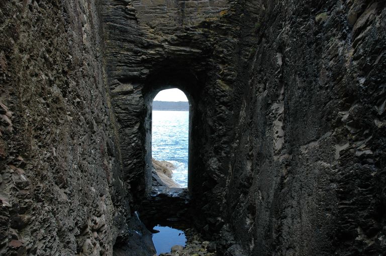 Sur (et au pied) de la pointe de Cornouaille[s]. Côtes Nord-ouest de la presqu'île de Roscanvel, à 2500 mètres Nord-ouest de l'agglomération de Roscanvel - 1500 mètres de la pointe des Capucins. Accès : par route militaire de ceinture de la presqu’île, branche Ouest.