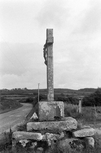 La croix, à l'origine placée au milieu d'un carrefour de chemins, a été légèrement déplacée depuis 1837. Socle et fût probablement 16e siècle, croix et Christ en croix refaits en 1912 (date gravée sur le socle).