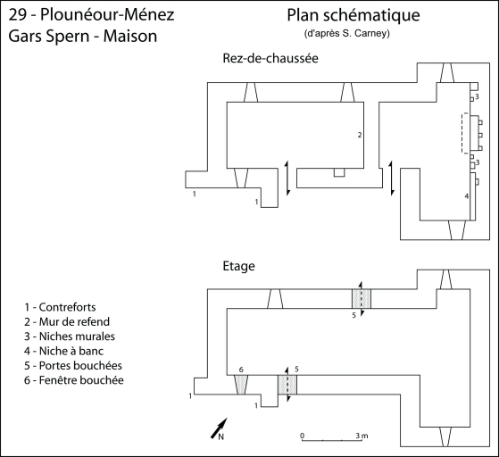 L'escalier extérieur, remplacé par un contrefort, a disparu. Cheminée monumentale en granite. Au nord de la salle, présence d'une avancée de faible profondeur indiquant peut-être l'espace réservé à l'emplacement d'un lit-clos (kuz gwele).