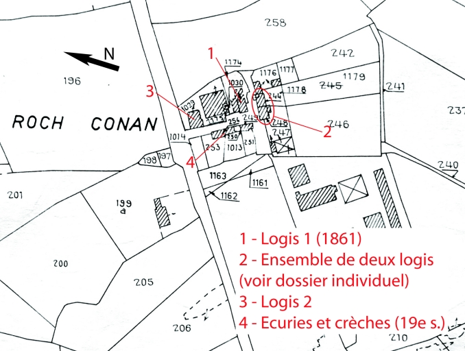 Hameau lié à la manufacture rurale de la toile dès le 17e siècle. Une buanderie existait au sud du hameau. Trois logis dont un étudié, un puits et plusieurs communs ont été repérés. Logis 1 reconstruit en 1861 (date portée) sur l'emplacement d'un logis plus ancien, sans doute à avancée. Dans la partie nord du village : grand logis à avancée disparu. Communs fin 19e siècle.