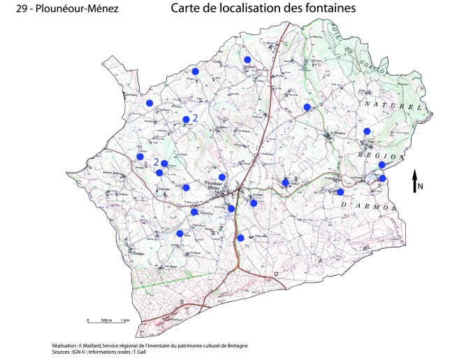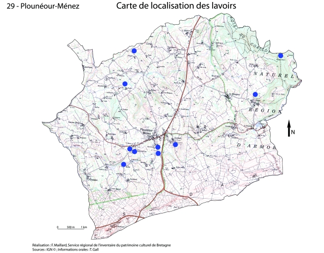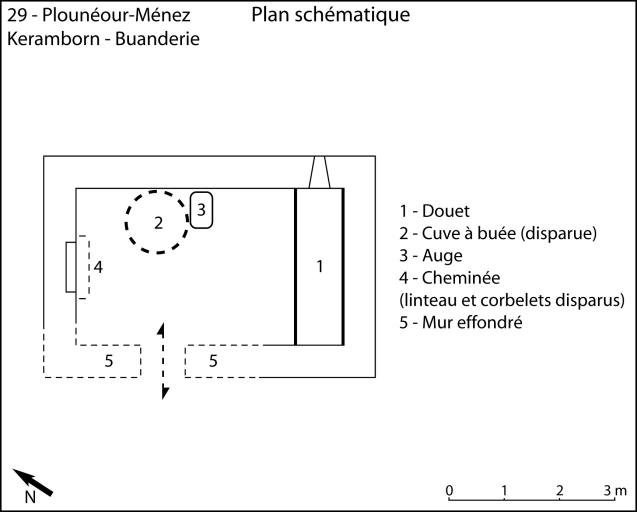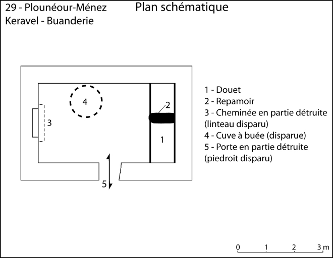 Parmi les 73 buanderies datant essentiellement des 18e et 19e siècles et connus par les archives et les travaux de recherche, vingt, encore identifiables, ont été repérées lors de l´enquête (élévations partielles, bassins, une ou plusieurs cuves à buée), et huit (bourg, Kerfrec, Kergavan, Kermorvan, Keryel, Resloas, Scarabin, Traon Stanc) ont fait l´objet d´un dossier individuel. Les autres, moins complètes, sont traitées dans ce dossier collectif. Sur l´ensemble des bâtiments identifiés, aucun n´a gardé sa toiture ; Kergavan et Scarabin ont conservé la quasi-totalité de leurs installations. La configuration géologique du secteur (massif granitique) a permis la confection, in situ, de grandes cuves ; cette activité a laissé des traces spectaculaires au sud-est de Resloas où certaines cuves ont été abandonnées en cours de taille, peut-être à la fin de l´activité toilière. FONTAINES. Parmi les 22 fontaines repérées lors de l´enquête, deux ont fait l´objet d´un dossier individuel (Dividou, Saint-Divy). Ces fontaines peuvent être civiles ou sacrées, isolées ou associées aux lavoirs ou buanderies. FONTAINES ISOLEES. Neuf fontaines de ce type ont été recensées (inventaire non exhaustif, abandon ou localisation difficile). Il s´agit en général de sources aménagées et limitées par quatre ou cinq dalles de schiste ou de blocs de granite (Dividou, Penher). Parfois, une cuve de buanderie remployée fait office de fontaine (Kergaër, Kersimonet). FONTAINES ASSOCIEES AUX BUANDERIES. Six fontaines de ce type ont été recensées dont une sélectionnée pour étude (Dividou). Elles irriguent les buanderies situées à peu de distance (ruisseau ou rigole creusée dans des dalles de granite comme à Kermorvan). FONTAINES ASSOCIEES AUX LAVOIRS. Cinq fontaines de ce type ont été repérées (Goasmelcun, Guirhoël, Kerguz, Kerhor, Kersimonet). Elles alimentent un lavoir par le biais d´un ruisseau. FONTAINES DE DEVOTION ASSOCIEES AUX LAVOIRS. Deux fontaines de dévotion ont été repérées : celle du Relec, situé à proximité de l´abbaye et traitée comme partie constituante (voir dossier ancienne abbaye cistercienne) et celle de Saint-Divy située à quelques dizaines de mètres de la chapelle (voir dossier individuel). A la fonction sacrée s´est ajoutée la fonction civile : ces deux fontaines, qui abritaient des statues aujourd´hui disparues, alimentent des lavoirs à usage public. LAVOIRS. Dix lavoirs en granite ou schiste ont été repérés lors de l´enquête. Suite au déclin de l´activité toilière, beaucoup de buanderies ont rempli la fonction de lavoirs. A Guirhoël, l´ancien lavoir a été remplacé dans la première moitié du 20e siècle par une construction en ciment. A noter également la présence de deux lavoirs à Kersimonet, distant d´une centaine de mètres et tous deux abrités dans un bâtiment en parpaing.