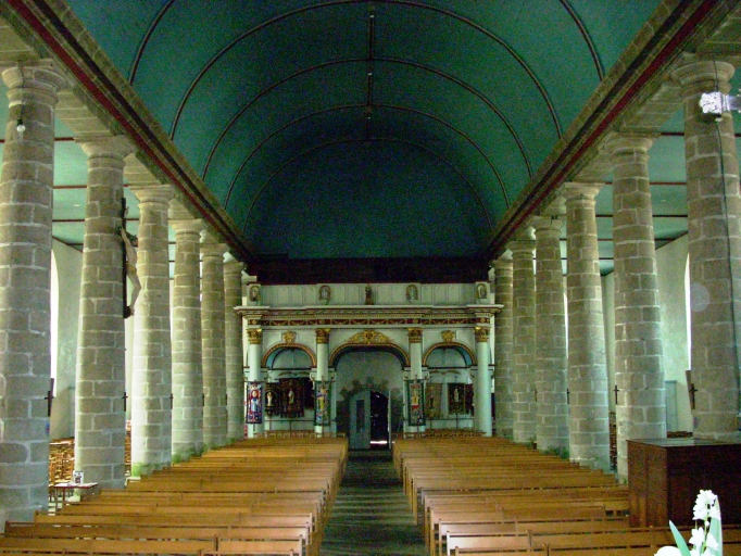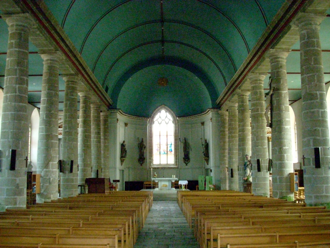 Edifice de plan rectangulaire à trois vaisseaux. Chevet plat flanqué au nord et au sud de deux sacristies dans-oeuvre à étage. Clocher hors-oeuvre à deux galeries et à deux étages de cloches, flèche octogonale ornée de crochets et encadrée à sa base par quatre lanternons et quatre frontons. Gros oeuvre en moellon de schiste et de granite à l´exception des encadrements des baies et des chaînages d´angle en pierre de taille de granite. Nef à neuf travées couverte d´un lambris peint en bleu. Architraves en bois reposant sur les colonnes galbées du bas. Tribune à l'ouest. Sol couvert de dalles de granite.