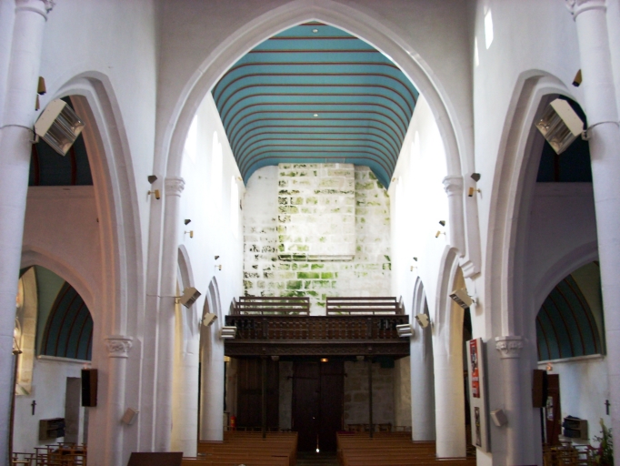 Plan en croix latine à trois vaisseaux. Sacristie hors-oeuvre, de plan hexagonal à comble à surcroît. Porche sud avec accolade à fleuron et pinacles terminés en consoles et nord hors-oeuvre. Clocher à deux chambres de cloches amorties d´un dôme à lanternon encadré à sa base de quatre pinacles. Gros oeuvre en moellon et pierre de taille, le tout peint en blanc à l´intérieur à l´exception du massif occidental. Sol couvert de dalles de granite. Faux transept ouvrant sur la nef par une arcade. Choeur peu profond à chevet plat, encadré de deux chapelles latérales ouvertes sur le choeur et sur les bras du faux transept par une arcade. Nef à trois travées couverte d'un lambris peint en bleu et nervures en rouge, éclairée par des fenêtres hautes géminées. Arcades en arc brisé pénétrant directement dans les colonnes.