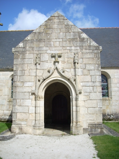 Sur le portail, Christ en croix sur le fleuron de l'accolade ; au sommet des pinacles statues en granite de la Vierge et de saint Jean ; dans le tympan petite statue de saint Gunthiern.