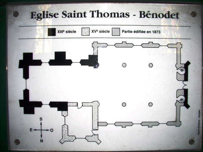 Bénodet est érigée en paroisse au début du 19e siècle au détriment du Perguet. Une chapelle, fondée sous le vocable de saint Thomas-Becket devient église paroissiale en 1802. Elle existe en 1231 puisque Eudes de Fouesnant la donne à l´évêque de Quimper qui en fit don à l´abbaye de Daoulas. Choeur du 13e siècle. Façade occidentale du 15e siècle. Nef, bas-côtés et clocher édifiés en 1873 par les entrepreneurs Auguste Michel et Jean-Louis Le Naour, d´après les plans de l´architecte diocésain Joseph Bigot. Restauration du choeur et refection du voûtement en 1889 d´après les plans du même architecte, par les entrepreneurs Pérodeau et Le Moyne.