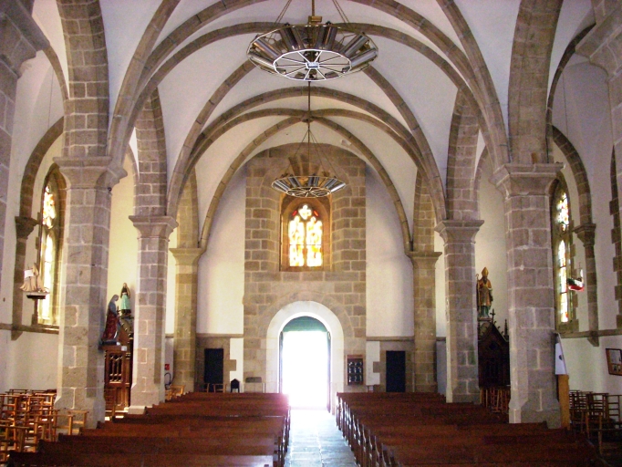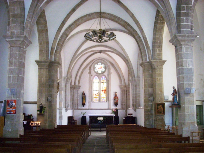 Plan allongé à trois vaisseaux. Pas de transept. Chevet plat. Clocher à chambre de cloches ajourée amortie d´une flèche ornée de crossettes et encadrée à sa base de quatre frontons ajourés et de quatre pinacles. Gros oeuvre en moellon de granite enduit, à l´exception des encadrements des baies, des chaînages d´angle et du massif occidental, en pierre de taille de granite. Nef à trois travées plus larges que le choeur. Arcades en arc brisé retombant sur les chapiteaux soutenus par des piliers carrés chanfreinés. Voûte à croisées d´ogives, bas-côtés voutés d´arêtes. Choeur de deux travées flanqué d´une sacristie au nord. Sol couvert de dalles de granite.