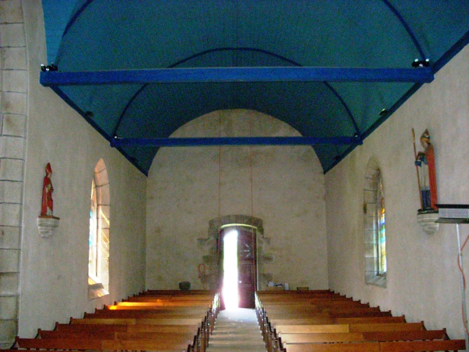 Plan en L, à vaisseau unique et bras sud. Chevet plat flanqué d´une sacristie de plan rectangulaire au sud. Clocher à chambre de cloches ajourée amortie d´une flèche octogonale ornée de crossette et encadrée à sa base par quatre gable ajourés et des pinacles. Gros oeuvre en moellon de granite enduit à l´exception des encadrements des baies, des chaînages d´angles, du massif occidentale et du bras sud en pierre de taille de granite. Lambris de couvrement, entraits et sablières peints en bleu. Sol couvert de ciment et de dalles de granite.