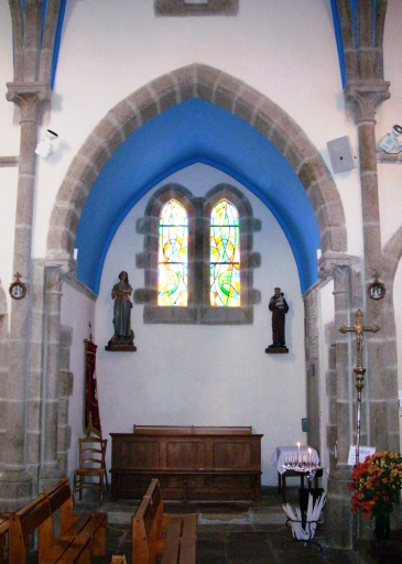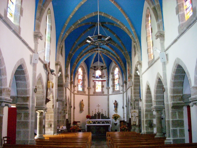 Plan en croix latine à trois vaisseaux. Chevet à pans coupés. Clocher hors-oeuvre à chambre de cloches ajourée amortie d´une flèche octogonale encadrée à sa base par quatre gables ajourés. Gros oeuvre en moellon de granite enduit de ciment à l´exception des encadrements des baies et des chaînages d´angle en pierre de taille de granite. Nef à trois doubles travées couverte d´une voûte à croisée d´ogives bleue, nervures reposant sur les colonnettes engagées de fond. Chapelles latérales au niveau de la troisième travée formant faux transept. Sol couvert de dalles de granite.