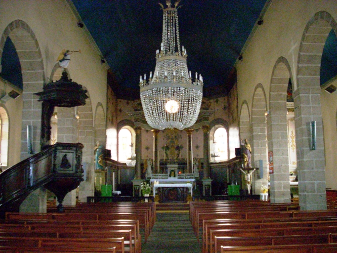 Plan allongé à trois vaisseaux. Chevet à pans coupés flanqué de deux sacristies dans-oeuvre. Clocher dans-oeuvre à deux galeries et à deux chambres de cloches amortis d´une flèche octogonale ornée de crossettes. Gros oeuvre en moellon de schiste et de granite enduit de ciment, à l´exception des encadrements des baies et des chaînages d´angle, en pierre de taille de granite. Nef à sept travées couverte d´un lambris peint : étoiles sur fond bleu. Arcades plein-cintre pénétrant directement dans les piliers carrés. Massif occidental portant tribune et orgue. Sol couvert de dalles de granite.