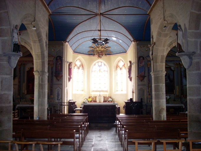 Plan en croix latine à trois vaisseaux. Chevet à pans coupés flanqué de deux sacristies symétriques. Clocher à deux étages de cloches amortis d´une courte flèche octogonale ornée de choux. Gros oeuvre en moellon de granite enduit de ciment, à l´exception des encadrements de baies et des chaînages d´angle, en pierre de taille de granite. Nef à trois travées couverte d´un lambris peint en bleu. Arcades plein-cintre reposant sur les chapiteaux des colonnes. Enduit décorés de motifs géométriques. Sol couvert de dalles de granite.