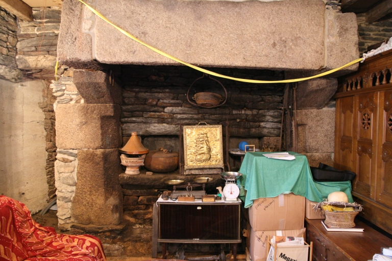 Logis à double orientation. Escalier de distribution extérieur au nord donnant accès à l'étage à usage de chambre (cheminée monumentale) et de grenier (cloison d'origine disparue). Salle du rez-de-chaussée avec cheminée monumentale en granite et saloir surmonté d'une armoire murale.