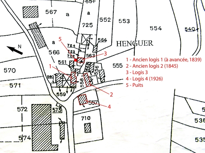 Le Hinguer sur le cadastre de 1836. Les anciens logis 1 et 2, antérieurs à 1836, remontent peut-être au 18e siècle. Les dates portées (1839 et 1845) semblent correspondre à des remaniements. Logis 3 début 20e siècle (?). Logis 4 construit en 1926, après le déclassement des anciens logis en dépendances agricoles.