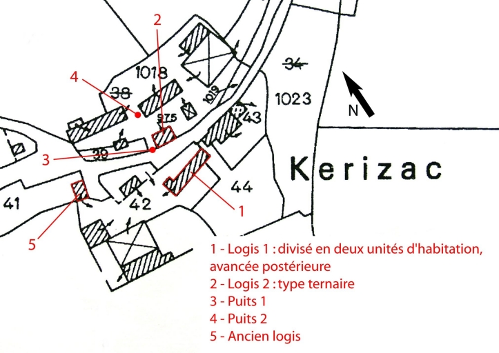 En 1448, Kerizac est attesté comme lieu noble appartenant à Jehan du Desnay. Il est en ruine en 1680. Figurant sur le cadastre de 1836, le logis 1, construit au 17e ou 18e siècle, a été divisé, peut-être au 19e siècle, en deux logements séparés par un mur de refend. Logis 2 et deux puits fin 19e ou début 20e siècle.