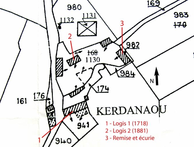 Kerdanaou est divisé en deux parties de dimensions inégales et bien visibles sur le cadastre de 1836. La partie sud était composée d'un grand logis daté 1718 (porte nord) qui dominait, au sud, un ensemble de bâtiments (dont un fournil) aujourd'hui disparu ; il donnait, au nord, sur une cour délimitée par des communs. Le logis a été amputé, au sud, d'un appentis dont subsistent quelques pans de murs et qui abritait vraisemblablement une tour d'escalier. De la seconde moitié du 19e siècle datent une ancienne ferme et ses dépendances (logis daté 1881) construits pour les familles Le Masson et Le Bihan.