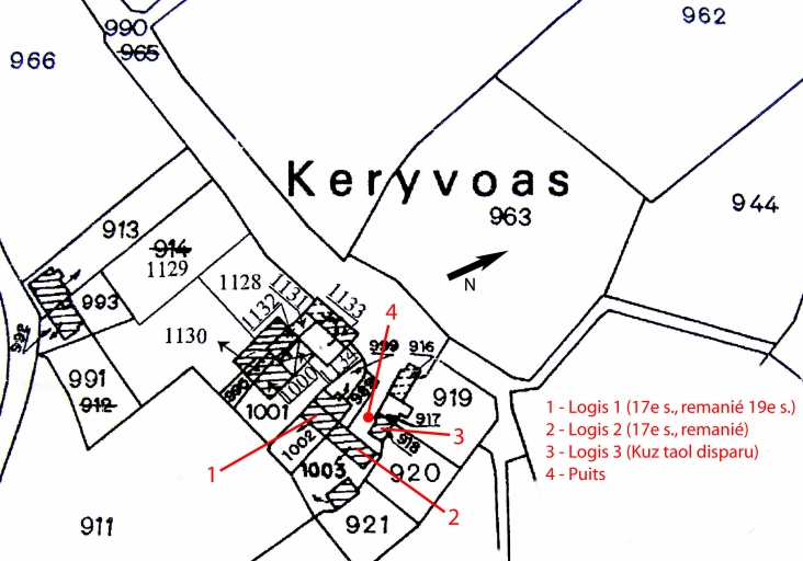 Cette ancienne exploitation agricole est composée de plusieurs logis et d'anciennes dépendances. Logis 1 : il figure sur le cadastre de 1836, date en partie du 17e siècle et a été reconstruit à la fin du 19e siècle. Logis 2 : 17e siècle (?), il figure sur le cadastre de 1836 avec une tourelle d'escalier, partie supérieure abaissée. Logis 3 : 17e siècle (?), il figure sur le cadastre de 1836, kuz gwele (niche à lit-clos) disparu. Vestiges d'un four à pain antérieur à 1836.