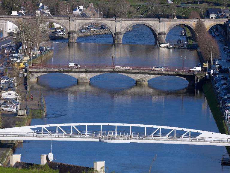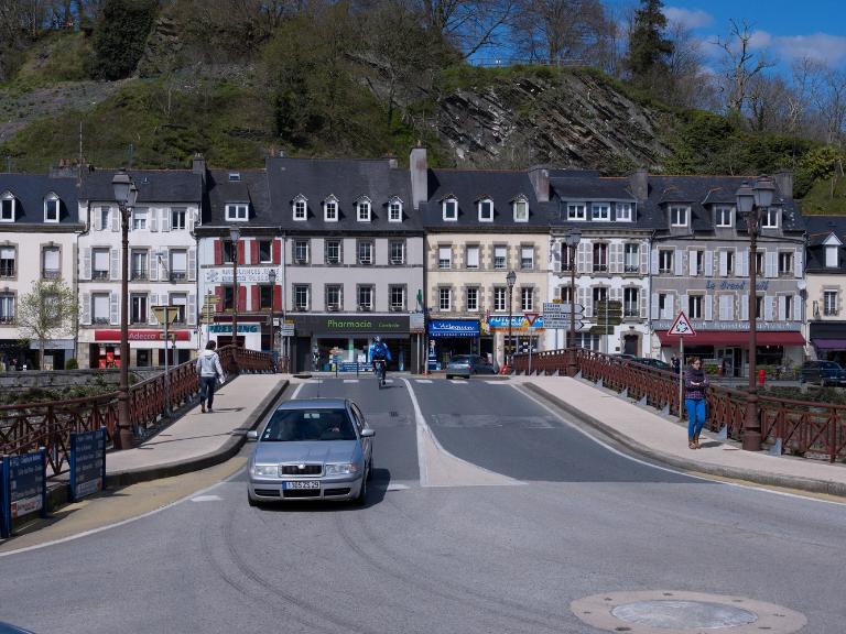 Pont à trois arches en arc surbaissé ; piles à becs semi-circulaires : pierre de taille de granite ; culées : moellons de schiste. Une cale de mise à l'eau sur chaque rive en aval du pont : grand appareil de granite. État actuel : tablier débordant en béton, garde-corps métallique récent (M. -D. Menant).