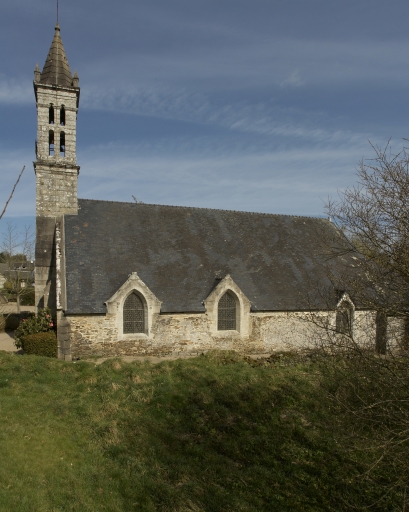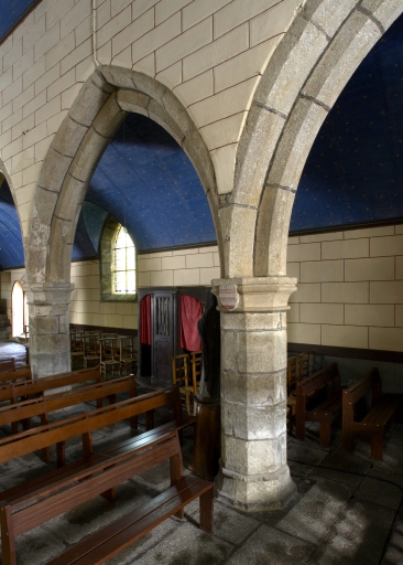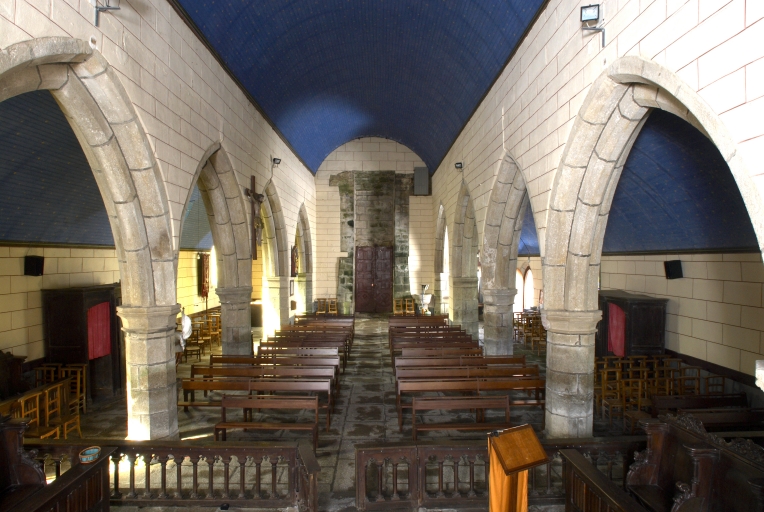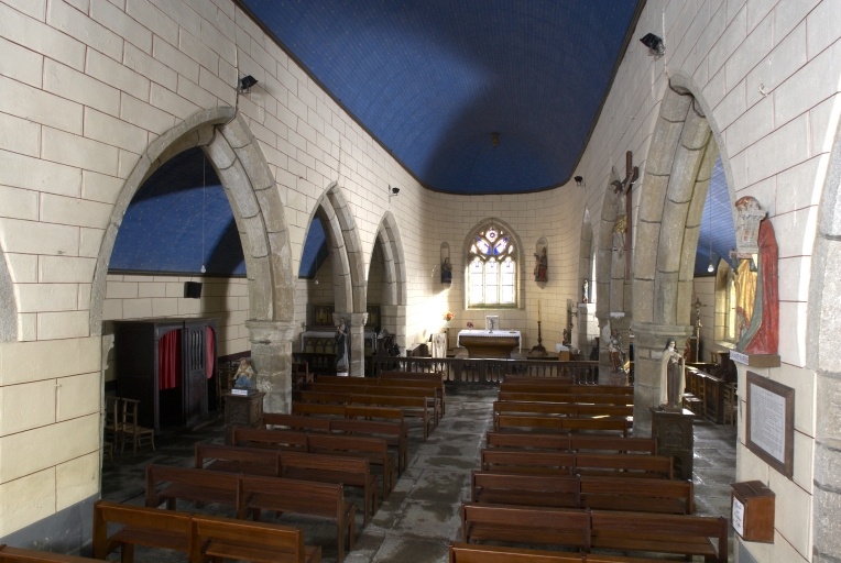 Mise en oeuvre en moellon de granite, à l'exception du porche, du clocher ainsi qu'une partie du mur nord, en pierre de taille de granite. Encadrements des baies, chaînages d'angle et contreforts en pierre de taille de granite. Plan allongé avec nef séparée des bas-côtés par des arcades en arc brisé formant quatre travées. Chevet arrondi avec maîtresse-vitre qui a conservé son réseau. Portail ouest avec tour d'escalier hors-oeuvre accolée (escalier en vis en granite). Escalier dans-oeuvre (en équerre en granite) éclairé par une baie géminée, situé à l'angle nord-ouest pour accéder à la tour d'escalier. Nef éclairée par trois fenêtres passantes au sud, deux au nord (dont deux, au nord et au sud, ont conservé leur réseau). Sol couvert de grandes dalles de granite.