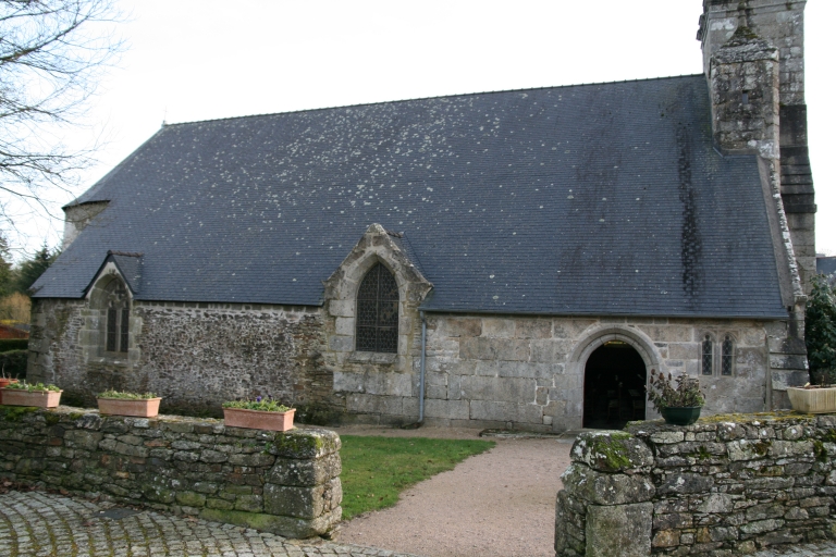 Edifice du 16e siècle ayant subit plusieurs campagnes de transformation et de restauration, en 1690 (date portée sur le mur nord avec inscription), en 1723 (date portée sur le porche) et vers 1830 (massif occidental). Les armes des seigneurs de la Haie Douar, portées sur le dernier pilier nord, ont été martelées. En 1818, l'enclos de l'église était plus restreint et englobait un ossuaire disparu en 1835. L'enclos a été agrandit suivant les plans de M. Duchesne, inspecteur de la mine d'Huelgoat. Tour et flèche de la seconde moitié du 19e siècle. Le cimetière a ensuite été tranféré en 1933.