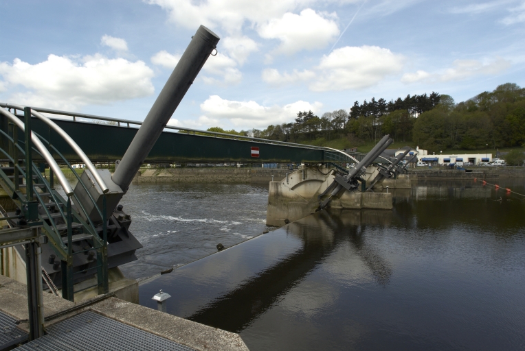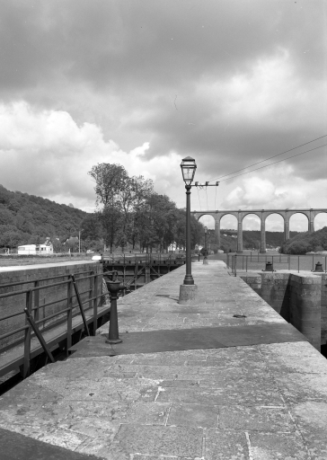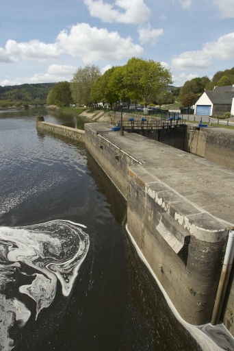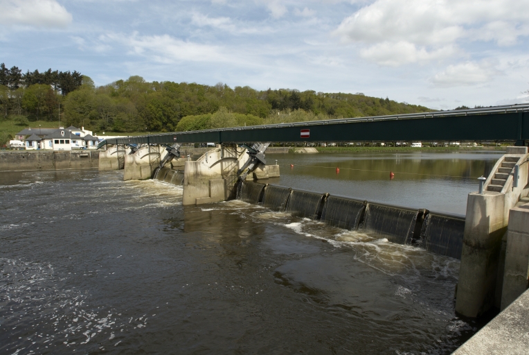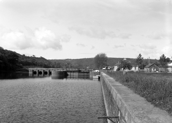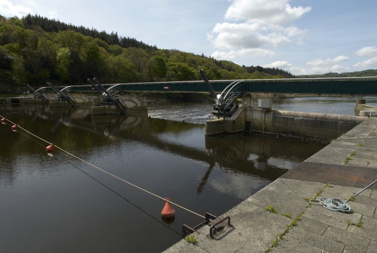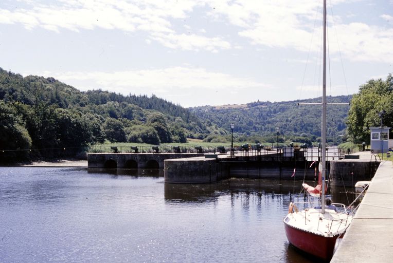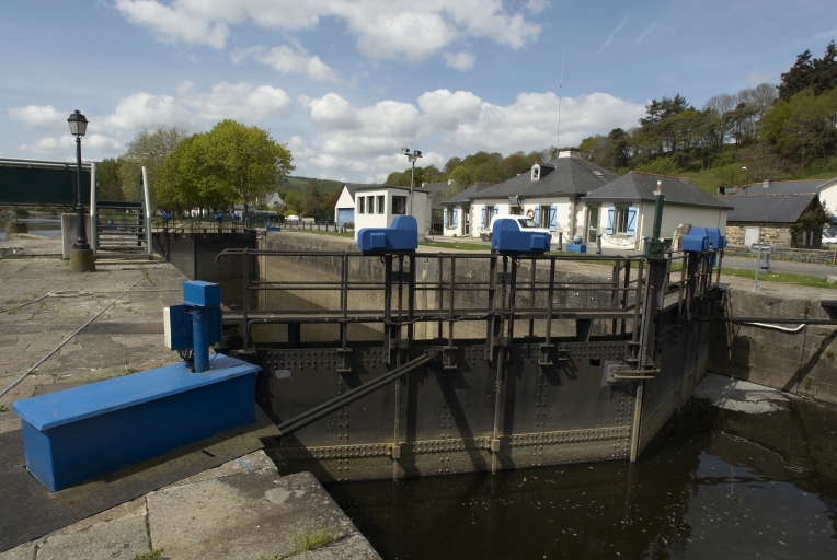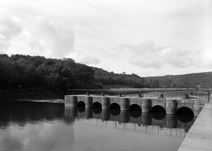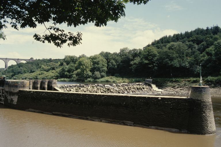 Écluse à sas ; pierre de taille de granite ; pare-gravier : moyen appareil de granite, parements supérieurs : grand appareil de granite. Déversoir & vanne au niveau du centre de l'écluse. Déversoir rectiligne. État actuel : passe à poissons centrale. Vanne à six éléments contre le bajoyer de large ; pierre de taille de granite. État actuel : pour lutter contre les effets de la marée, le déversoir et la vanne ont été remplacés par un barrage déversoir, surmonté d'une passerelle (M. -D. Menant).