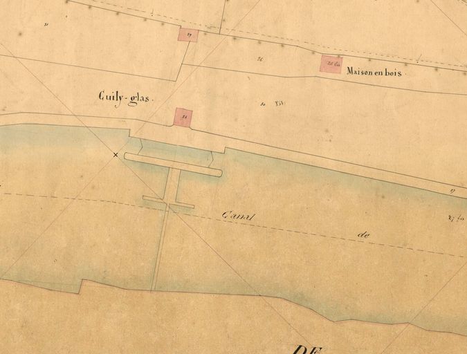 Navigation intérieure. Canal de Nantes à Brest. Département du Finistère. Rivière d'Aulne. 1ère feuille. Plan général de la Rivière d'Aulne depuis Guilyglas jusqu'à Lothey comprenant les écluses n° 1, 2, 3, 4, 5, 6, 7, 8, 9 et 10. Plan, par Guillaume Goury, dit Goury aîné, ingénieur en chef des Ponts et Chaussées, 28 janvier 1829. Papier, encre, aquarelle.