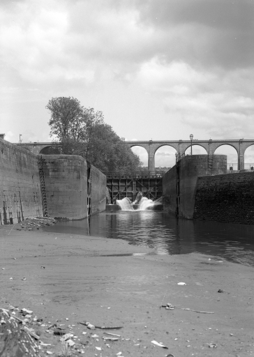 Commencée en 1845, l´écluse fut inaugurée en août 1858 par Napoléon III ; elle permit la création du bassin à flot de Port-Launay en régulant le cours de la rivière en fonction des marées. En 1899-1900, installation d´une passe à poissons. Importantes transformations de la vanne et du déversoir en 2003 (M.-D. Menant).