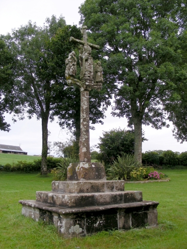 Fût en granite, croisillon en kersantite. Face ouest : saint Marc (partie inférieure du fût). Christ en croix, Vierge, saint non identifié (saint Yves ?), anges recueillant le sang du Christ dans un calice, sainte Face (sur le noeud). Face est : saint Jean, évêque (saint Exupère ?), saint François d´Assise, blason sur le noeud. Statues géminées (sculptées dans un seul bloc) : Vierge et saint François d´Assise, saint non identifié (saint Yves ?) et saint Jean.