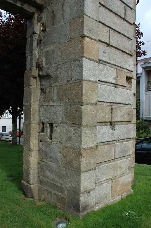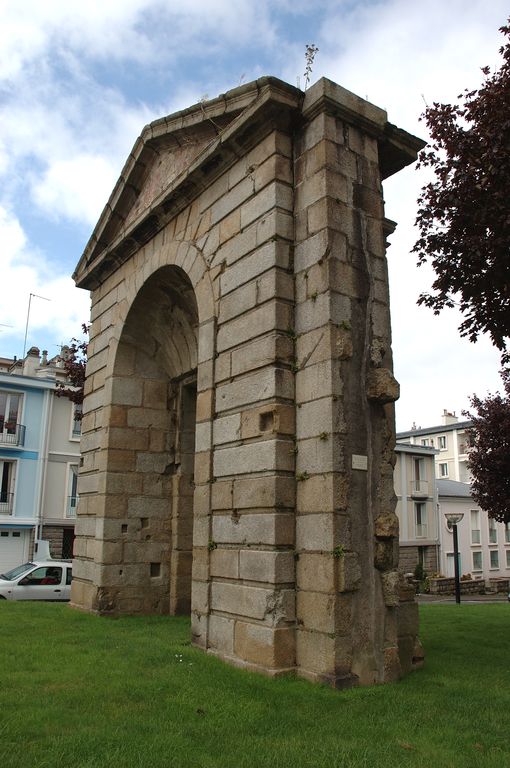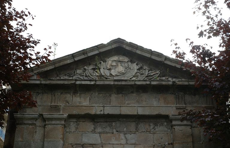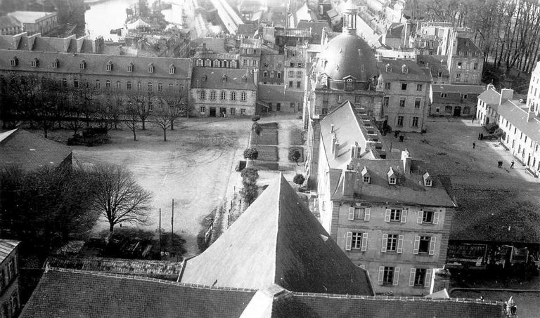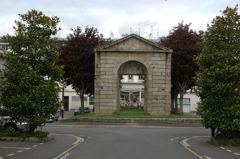 Square Commandant l´Herminier : porte monumentale de l´ancien séminaire des Jésuites conservée et remontée à l´emplacement de l´ancienne préfecture maritime. Trophée avec armes, drapeaux et ancre de marine sur le fronton.