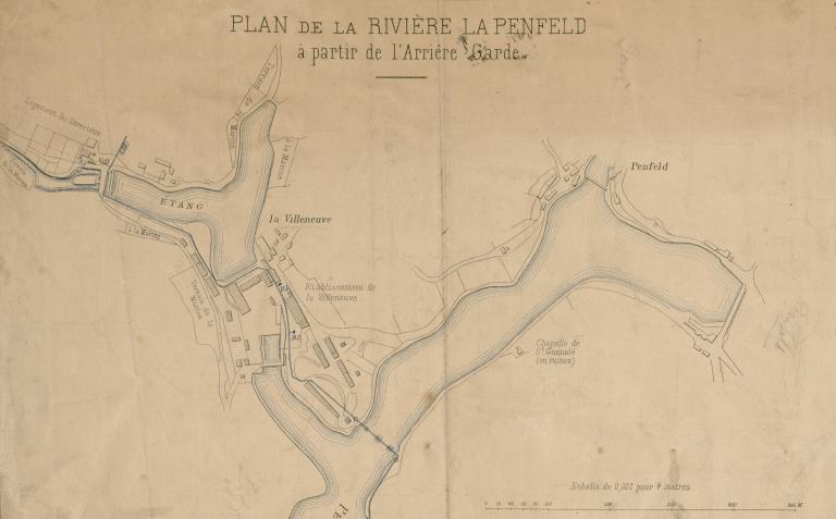 Entre 1777 et 1783, le Fort de Penfeld qui constitue la droite du camp retranché de Saint-Pierre est construit à proximité immédiate au nord. Le plan-relief de Brest réalisé entre 1807 et 1811 figure le Fort de Penfeld et les forges de la Villeneuve dans leur environnement. Deux moulins et cinq roues - alimentées par trois conduites aménagées dans la digue de l’étang - figurent dans les relevés du plan-relief. Le déversoir de la retenue d’eau apparaît à l’extrémité sud de la digue. Approvisionnements et expéditions se font par voie maritime, à marée haute avec des chalands.