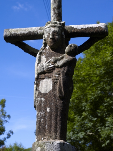 Emmarchement à deux degrés, base carrée, fût chanfreiné à griffes, noeud avec décor sculpté (anges tenant un calice pour recueillir le sang du Christ/armoiries). Face sud : Christ en croix. Face nord : Vierge à l'Enfant, Vierge couronnée.
