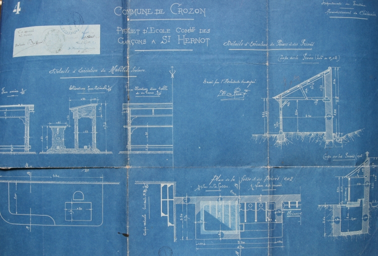 En 1908, un projet d´école communale de garçons à Saint-Hernot est dressé par l´architecte H. Ruer de Douarnenez. Vu et approuvé par le préfet qui « autorise à mettre les travaux à exécution » en 1909, le projet verra le jour, vraisemblablement vers 1910, en grande partie conforme aux préconisations de l´architecte qui dresse également les plans du mobilier scolaire et des huisseries (détails d´exécution). Les travaux seront réalisés par les entrepreneurs Vassal, Bizien, Bargain, Vignard, Tanguy, Le Roux, Baudoin, Héliès et Marc pour la somme de 35 000 francs. Aujourd´hui propriété communale, le bâtiment, dont la gestion dépend du Parc naturel régional d´Armorique, a été réhabilité en 1987 en musée, la « Maison des minéraux », géré par l´association C.R.E.P.P.N. (Centre Régional d´Étude et de Protection du Patrimoine Naturel).