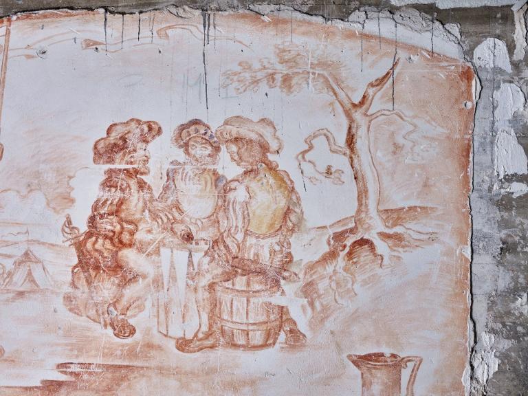 La grande peinture murale est peinte en ocre rouge et en brun dans le style sanguine. Elle figure au deuxième plan, à hauteur du regard, trois lansquenets (soldats mercenaires, en allemand Landsknechte) assis jouant aux dés sur un tambour et un quatrième lansquenet, debout, lance à la main et épée au ceinturon montant la garde. Cheveux longs, barbu pour au moins l’un d’entre eux, ils arborent des vêtements de la Renaissance : souliers, chausse courte bouffante à mi-cuisse, pourpoint, toque et épée au ceinturon. A droite de la composition se trouve représenté un arbre feuillu.