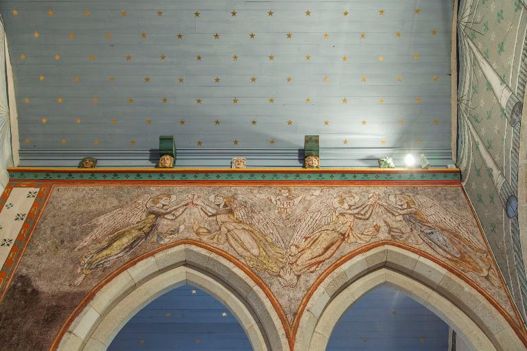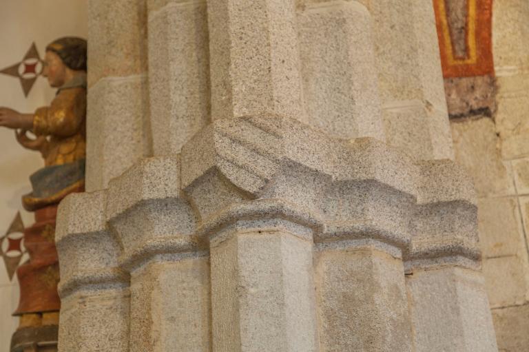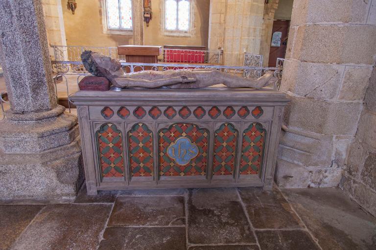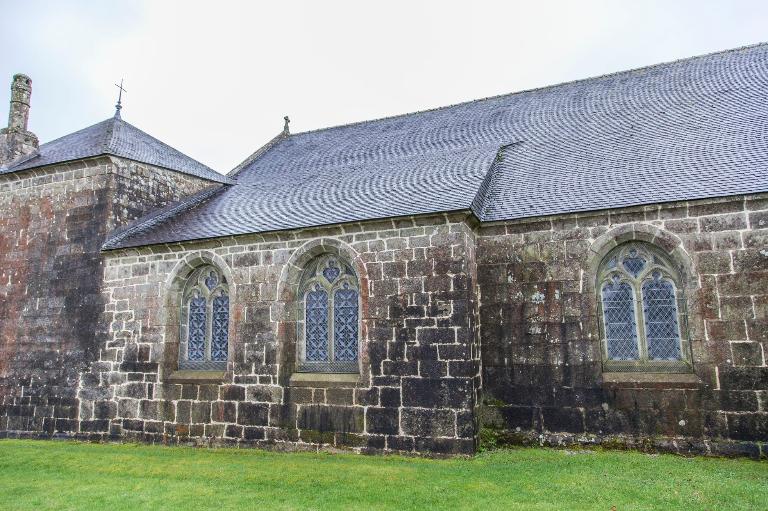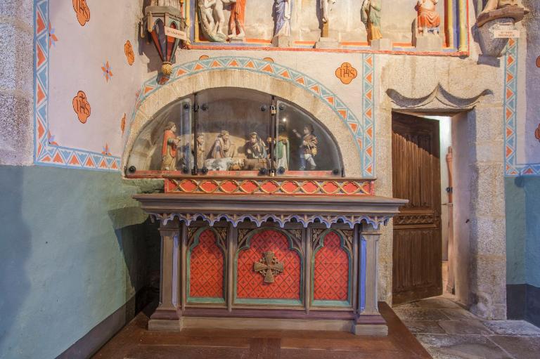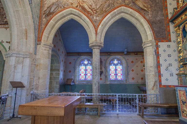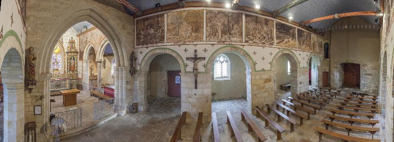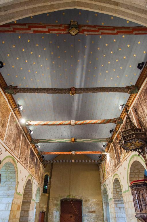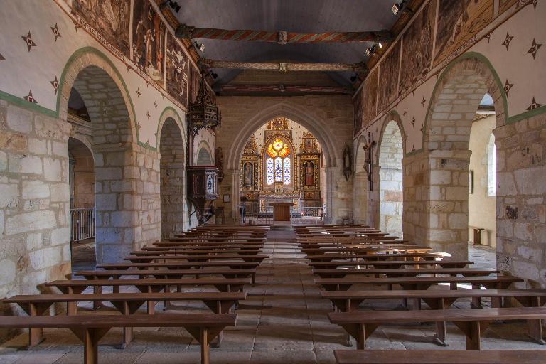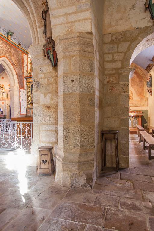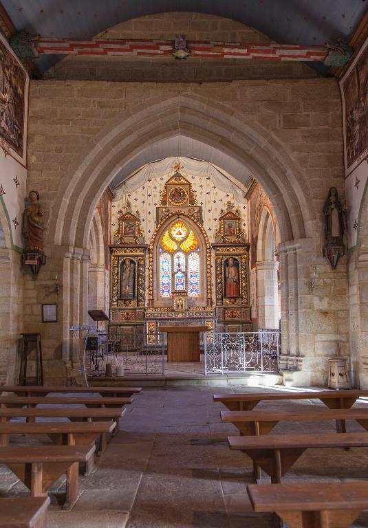 À l’intérieur, la nef est flanquée de deux collatéraux divisés en quatre travées, l’ensemble indique le milieu du XIIe siècle. Le vaisseau central est séparé des bas-côtés par une série d’arcs en berceau supportés par des piles rectangulaires chanfreinées aux angles au tailloir mouluré en cavet à hauteur d’imposte. La reconstruction moderne de la façade occidentale se devine sur les piliers engagés de la première travée qui devaient – semble-t-il – accueillir une arcade à pénétration directe. Les charpentes de la nef et des bas-côtés ont été refaites par la fabrique en 1828 comme le montre une inscription sur un des entraits du bas-côté sud : FAIT. FAIRE. PAR. PIERRE LE LVREL. FABRIQVE. 1828. Les piliers engagés à pans multiples de la dernière travée de la nef dénotent une phase de construction au courant du XIVe siècle correspondant au chantier du chœur et de ses chapelles. Il est séparé de la nef par un arc triomphal en arc brisé aux voussures simplement chanfreinées qui reposent sur des piliers engagés à faisceau de cinq colonnettes frappées au nord d’un écu à trois cotices. Le chœur est flanqué de deux chapelles subsidiaires, une dédiée à Sainte-Anne, l’autre à Saint-Jean divisées en deux travées par deux arcades en tiers-point qui s’appuient à leur rencontre sur une fine colonne octogonale. Ces arcades - en particulier les fines piles octogonales - semblent plus récentes que le reste de l’élévation du chœur. Plusieurs visages sculptés rythment les sablières nord et sud du chœur. La chapelle dédiée à Saint-Jean au nord enferme un ensemble statuaire remarquable de la seconde moitié du XVIe siècle. Au mur pignon oriental, dans une cavité rappelant un enfeu, un groupe de statuettes figure la scène de la Nativité, les détails de la charpente de la grange sont peints au fond de la crèche. Au-dessus, un haut-relief empruntant la composition d’un retable évoque plusieurs scènes christiques : à gauche, le Christ délivrant Adam et Eve des Enfers, au centre, une Crucifixion accompagnée de Saint-Jean et de Marie et à droite, un Christ en Majesté sur un trône grossièrement taillé. L’ensemble est cerné de colonnettes toriques dépourvues de chapiteau et se prolongent en une accolade qui surmonte la crucifixion. A quelques mètres contre le chœur, un gisant figurant le Christ sur son sépulcre manifeste une fois de plus la pleine dévotion du Saint-patron de la chapelle Saint-Sauveur de Coadry.