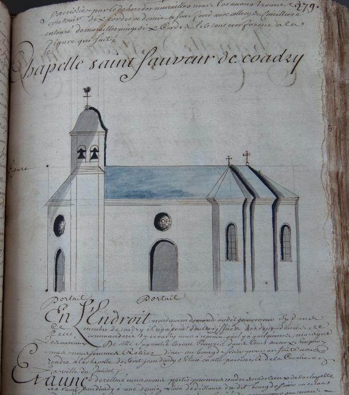 S’il y a bien une aumône de Busic in Stahart confirmée à Scaër en 1182 pour l’Ordre du Temple, il faut la situer au village de La Boissière, nommée autrefois Beuzit ou Buzit. L’origine de la chapelle de Coadry est sans doute à mettre en relation avec la seigneurie de Trévalot à 900m au nord, dont il subsiste une motte et une basse-cour proche de l’actuel manoir. En 1539, « la chapelle et village de Coadri » dépendent de la commanderie de Quimper et Beauvoir. Puis, elle appartient à la commanderie de La Feuillée selon une déclaration de 1697, la chapelle est alors nommée sous le vocable du Christ avec « offrandes, oblations, rentes et revenus d’icelles apartiennen au sieur commandeur ». Un procès éclate en 1704 entre le recteur de la paroisse de Scaër et le commandeur de La Feuillée qui aboutit à la répartition des offrandes de la chapelle uniquement pour son entretien, plus un tiers pour le recteur de Scaër qui doit verser la somme de 25 sous annuellement au commandeur pour le patronage. Un an plus tard, les origines de la chapelle « Saint-Sauveur » de Coadry semblent susciter la curiosité des commandeurs car sur le croquis d’arpentement de 1705 ont été dessinées une croix de Malte et une croix pattée séparées d’un point d’interrogation. En 1720, il est fait état de peintures recouvrant le sanctuaire aux motifs floraux et aux « figures représentant la passion de Notre-Seigneur et plusieurs autres histoires sacrées ». La visite de 1758 détaille brièvement l’état de la chapelle Saint-Sauveur-de-Coadry, « sur le bord d’une grande lande dans les montagnes », elle possède une charpente neuve mais « elle manque d’ardoises et est percée en différents endroits ». Sur le cadastre de 1828, le cimetière est nettement indiqué à la moitié méridionale du placître alors qu’aujourd’hui il n’en subsiste aucune trace.