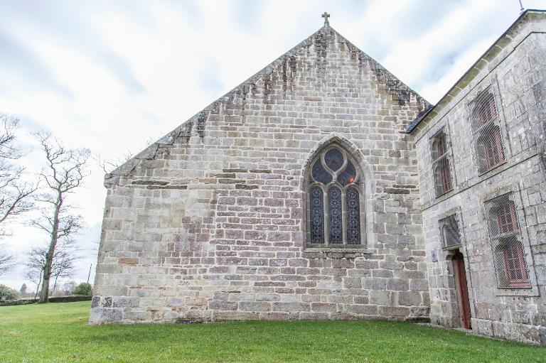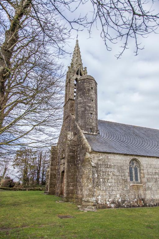 La chapelle Saint-Sauveur-de-Coadry est édifiée au centre d’un placître ceint d’un muret de pierre dont l’accès est rendu possible par une ouverture moderne au sud. Deux croix monolithes semblant datées du Moyen-Âge marquent l’entrée. L’édifice est entièrement construit en grand appareil de granite et présente un plan allongé dépourvu de transept terminé par un chevet plat. La façade occidentale est soutenue par deux contreforts blasonnés adossés au mur pignon et de deux autres aux angles, tous couverts en bâtière. Sur la frise de l’entablement du portail occidental, on peut lire l’inscription MISSIRE. RENE. MORVESEN. RECTEVR., ses travaux sont datés de 1697 comme l’indique le cartouche lapidaire au tympan du fronton brisé. La façade occidentale est sommée d’un clocher de type cornouaillais flanqué d’une tour-escalier octogonale coiffée d’un dôme. Aux gouttereaux nord et sud, les fenêtres sont toutes rigoureusement identiques et paraissent aussi de la fin du XVIIe siècle. Elles sont composées d’un remplage à deux lancettes surmontées d’un soufflet pour unique élément du réseau. Au sud, deux ouvertures ouvrent le bas-côté, une porte à linteau monolithe sur coussinet à l’ouest et une porte moulurée en cavet surmontée d’une archivolte en accolade ornée de choux frisés et terminée d’un puissant fleuron à l’est. L’archivolte repose sur des culots aux motifs de dragon et de singe. À droite, un contrefort couvert en bâtière et blasonné vient contrebuter l’arc triomphal de la nef. Le chevet est plat et percé d’une fenêtre moderne à trois lancettes surmontées de deux mouchettes et d’un soufflet au réseau. Un coup de sabre proche de l’angle sud-est indique une reprise de la maçonnerie lors de la réfection de la chapelle dédiée à Sainte-Anne contre le chœur.
