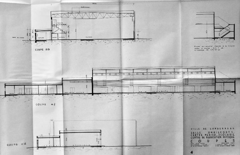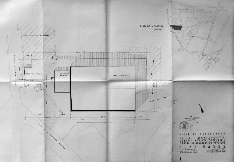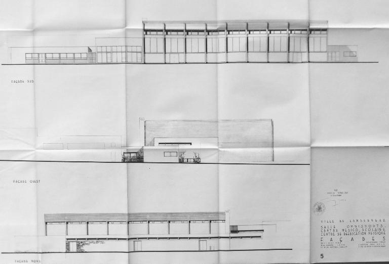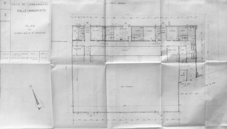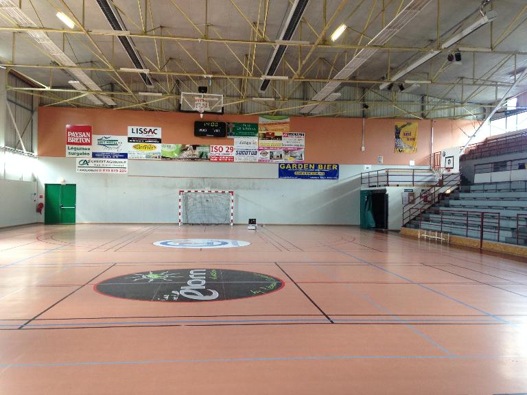 "La salle omnisports de Landerneau a été construite par la ville avec des subventions de l'Etat (Education nationale). Par délibération du 16 avril 1961, le conseil municipal a adopté le principe de cette construction et entériné une convention prévoyant que la salle serait affectée en priorité aux besoins du lycée sur lequel elle aurait des accès directs." Le permis de construire est délivré le 26 mars 1965. Les travaux, confiés à l'entreprise Quéméneur, débutent le 13 juin 1966 et sont achevés le 30 novembre 1967. La réception définitive est prononcée le 13 février 1969. L'architecte Cyril Glover rénove le bâtiment en 1994.